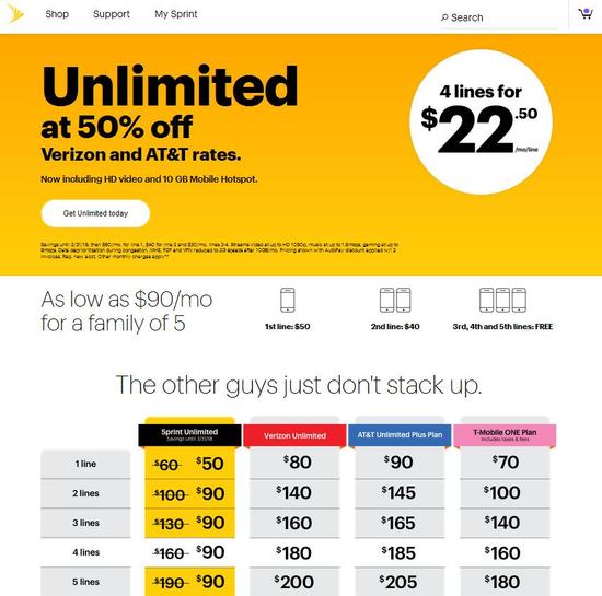 比方,Sprint推出了“流量吃到飽”計劃(下圖),一個有五張手機(jī)卡的家庭每個月的費(fèi)用低至50美元,除了流量無上限以外,還包含不限時長的通話和不限數(shù)量的短信。