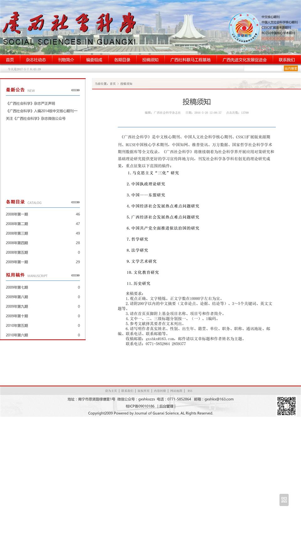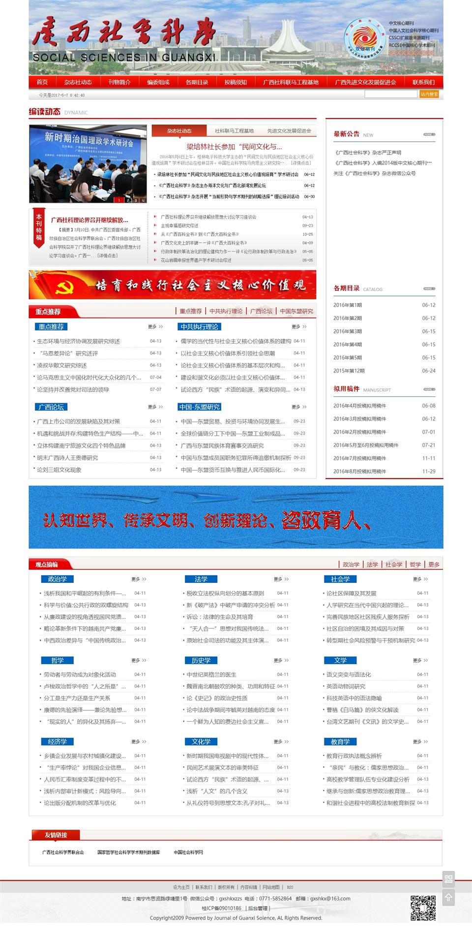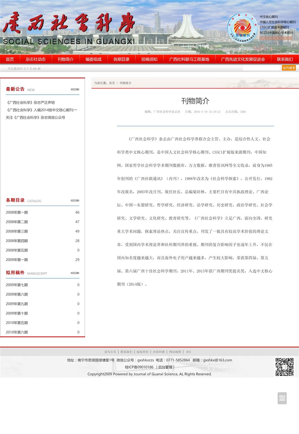 《廣西社會(huì)科學(xué)》雜志由廣西社會(huì)科學(xué)界聯(lián)合會(huì)主管、主辦,是綜合性人文、社會(huì)科學(xué)類中文核心期刊,是中國(guó)人文社會(huì)科學(xué)核心期刊、CSSCI擴(kuò)展版來(lái)源期刊,中國(guó)知網(wǎng)、國(guó)家哲學(xué)社會(huì)科學(xué)學(xué)術(shù)期刊數(shù)據(jù)庫(kù)、萬(wàn)方數(shù)據(jù)、維普資訊網(wǎng)等全文收錄,前身為1985年創(chuàng)刊的《廣西社聯(lián)通訊》(內(nèi)刊),1988年改名為《社會(huì)科學(xué)探索》,公開發(fā)行,1992年改現(xiàn)名,2003年改月刊。